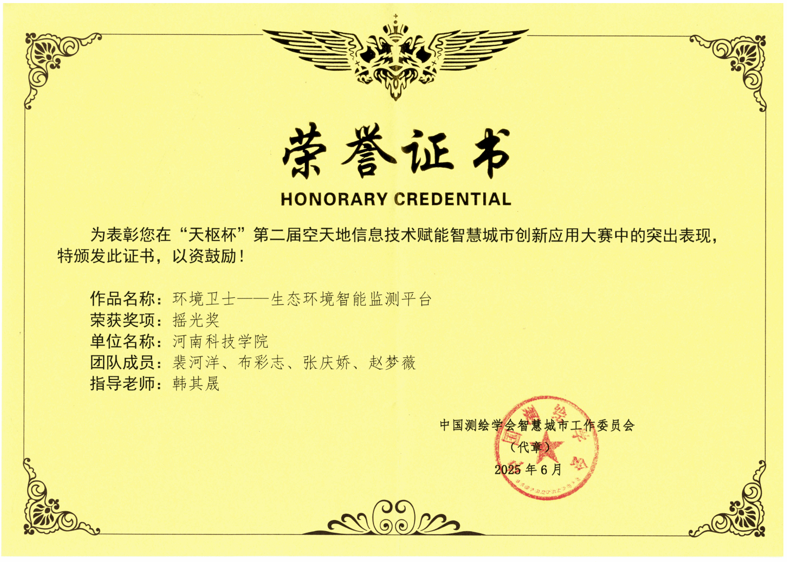 6月26—28日,由中国测绘学会主办的第二届“空天地信息技术赋能智慧城市创新应用大赛”颁奖仪式在武汉顺利举办。本次竞赛共吸引了中山大学、同济大学、中南大学、中国地质大学等全国200多所高校及公司队伍参赛(大赛奖项设有天枢奖、天璇奖和摇光奖),经过提交作品、网评初赛,最终同一赛道有19支队伍进入总决赛。经过激烈角逐,我院韩其晟老师指导的风景园林专业2024级硕士研究生裴河洋、布彩志、张庆娇、赵梦薇同学的参赛作品《环境卫士——生态环境智能监测平台》在生态环保赛道中脱颖而出,荣获大赛摇光奖。