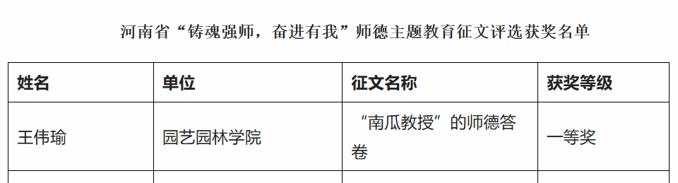 近日,河南省教育厅办公室下发了《关于公布“铸魂强师,奋进有我”师德主题教育征文、演讲比赛和师德师风建设优秀案例评选结果的通知》(教办师〔2025〕197号)。经过专家评审、综合评议,我院王伟瑜老师荣获河南省“铸魂强师,奋进有我”师德主题教育征文一等奖。