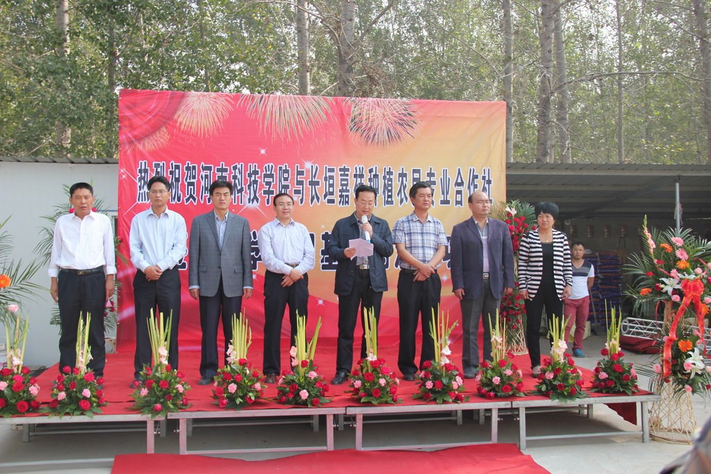 2013年10月11日上午,园艺园林学院教学实习基地挂牌仪式在长垣县嘉祥种植农民专业合作社隆重举行。参加挂牌仪式的各级领导有:主管教学的副院长王文鹏、院长助理兼教务处处长赵一鹏、园艺园林学院院长刘会超、教务处实践教学科科长康芳、中共长垣县人民政府副县长徐鹏越、副县长宁俊博、长垣县满村镇镇长付东立、长垣县嘉祥种植农民专业合作社社长曹红霞。河南科技学院园艺园林学院教师周秀梅、李保印、王艳丽及40多名学生代表也参加了挂牌仪式。