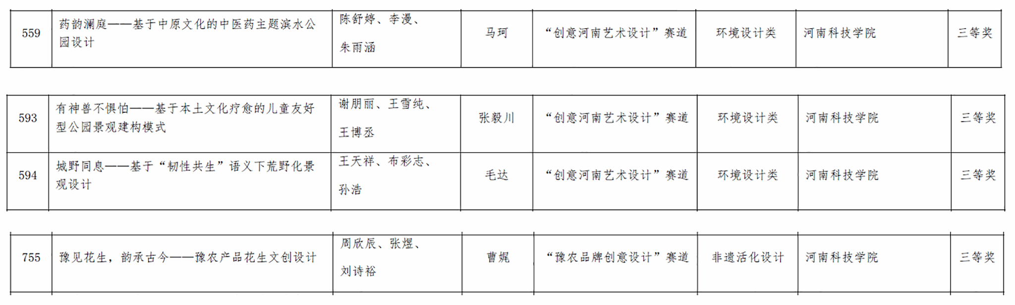 在环境设计类竞赛中,张毅川老师指导的谢朋丽、王雪纯、王博丞同学作品《有神兽不惧怕——基于本土文化疗愈的儿童友好型公园景观建构模式》荣获三等奖;马珂老师指导的陈舒婷、李漫、朱雨涵同学作品《药韵澜庭——基于中原文化的中医药主题滨水公园设计》荣获三等奖;毛达老师指导的王天祥、布彩志、孙浩同学作品《城野同息——基于“韧性共生”语义下的荒野化景观设计》荣获三等奖。在非遗活化设计类竞赛中,曹娓老师指导的周欣辰、张煜、刘诗裕同学作品《豫见花生,韵承古今——豫农产品花生文创设计》荣获三等奖。