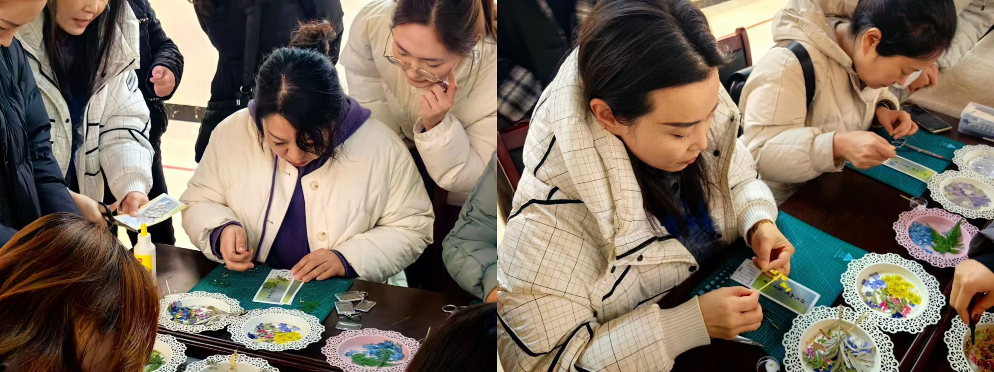 展览现场,我院刘砚璞老师受邀为全体参训教师作压花艺术专业导览讲解。她从艺术性、技术性、教育性三个维度,系统阐释压花艺术通过植物采集、干燥处理、设计制作实现从自然美到艺术美升华的过程,指出其是融合劳育、智育、美育与德育的综合教育载体,相关作品为中小学美育课程开发提供了丰富灵感。参观中,教师们驻足观摩作品,围绕材料、技法及教学转化等问题与刘老师深入交流,普遍认为该艺术形式易推广,能有效激发学生动手热情与观察力,涵养学生的耐心专注品质与生态美感。活动还设置了压花手工实践环节,在刘老师的指导下,参训教师亲手制作书签、钥匙扣,全程体验创作乐趣与细节,现场气氛热烈。本次活动充分践行“即学即用、寓教于艺”的培训理念,是我院发挥专业优势、服务社会美育推广的生动体现。