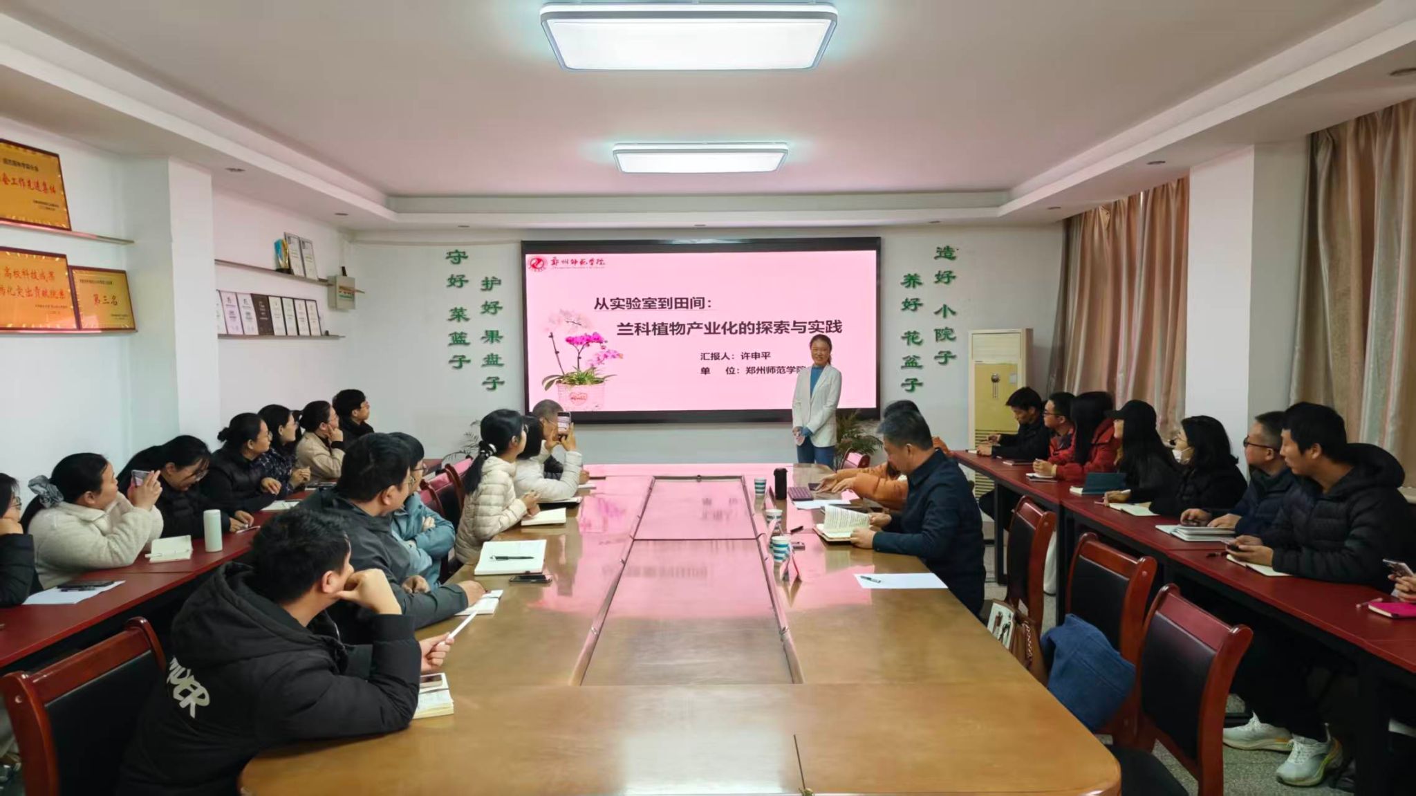 3月19日,应园艺园林学院邀请,我校校友、郑州师范学院许申平教授在实验楼B316会议室作题为《从实验室到田间:兰科植物产业化的探索与实践》的学术报告,并就科研成果转化与产业化发展进行指导。学院领导班子成员、科研团队负责人以及近五年入职的青年教师共30余人参会,会议由学术副院长袁敬平主持。