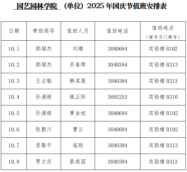 2025年国庆、中秋节值班安排